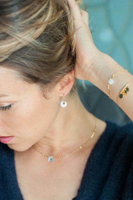 Boucles d’oreilles avec disque irisé en laiton doré à l’or fin et puce en acétate.
