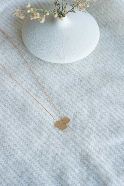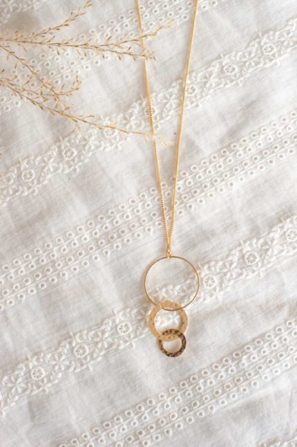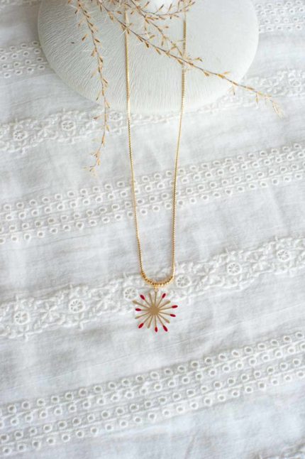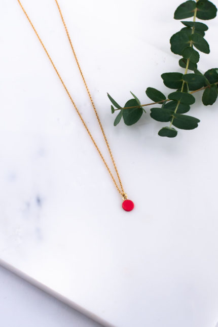 Collier chaîne fine en laiton doré à l’or fin avec losange émaillé et pièce ajourée en laiton.